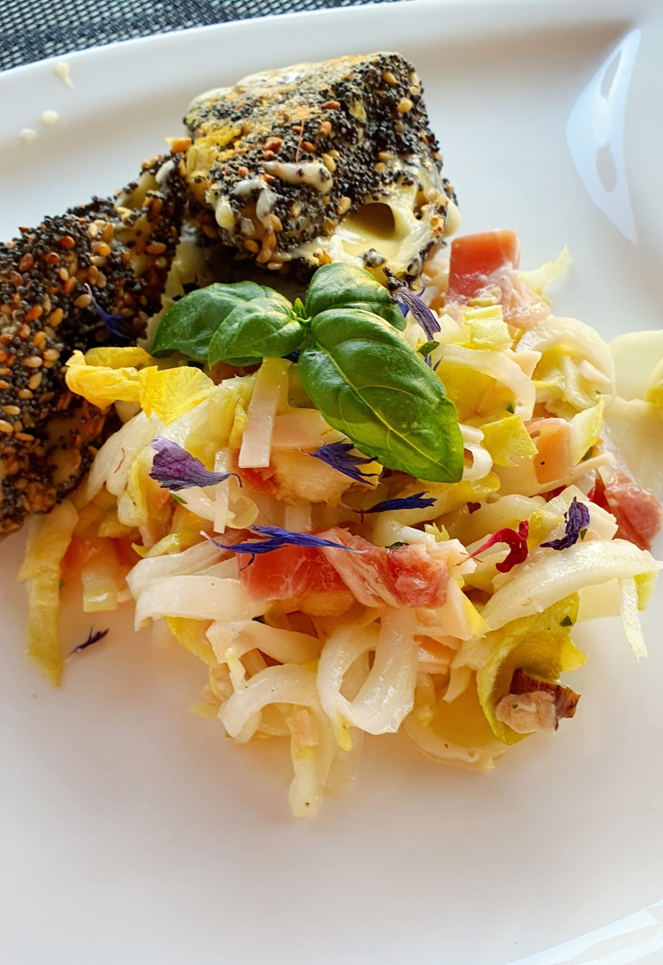 Pour le dressage : déposez directement sur assiette un lit de salade d'endives, déposez par dessus 2 camemberts panés, décorez avec des herbes aromatiques et fleurs comestibles.