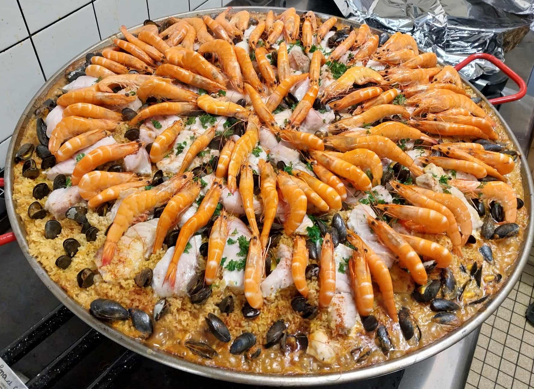 Variante : Ajoutez un poisson blanc (type cabillaud ou lien noir) 10 à 15 minutes avant la fin de la cuisson comme ici et je décore avec des grosses crevettes sur tout le dessus de la paella.