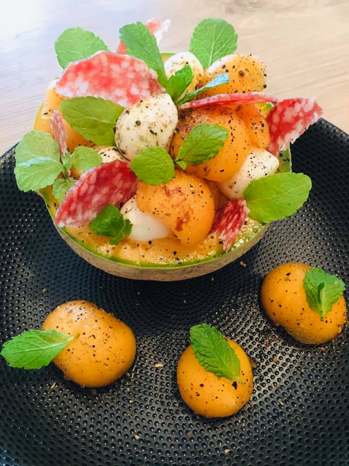 Dans les fonds de melon, déposez la salade, dressez harmonieusement les tranches de saucisson, décorez avec des feuilles de menthe et donnez un dernier tour de poivre moulin.